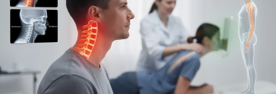 Face à cette douleur aiguë, le corps cherche instinctivement une position antalgique, souvent en fléchissant légèrement le cou et en projetant la tête vers l’avant. Cette posture diminue parfois la compression sur la racine mais accentue la rectitude cervicale visible sur les clichés radiographiques. Si la hernie n’est pas prise en charge, ces schémas posturaux de compensation peuvent s’ancrer dans le temps et entretenir le redressement du rachis cervical.
